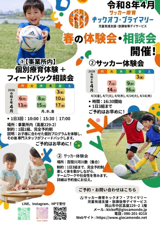 - 4月3日から、個別療育体験会(室内)とサッカー体験会(百間川河川敷)を行います!詳細は↓のチラシを参照してください。クリックで拡大します。